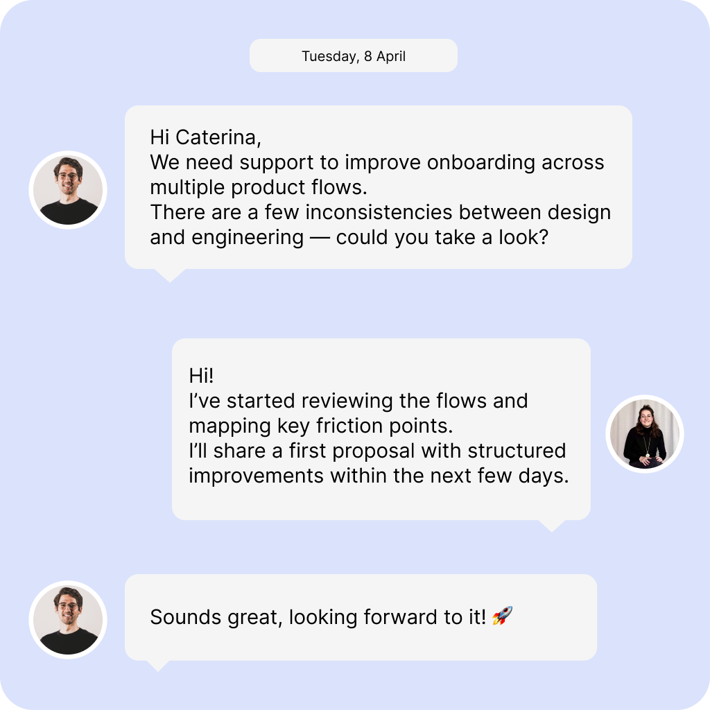 I quickly integrate into existing teams and workflows, understanding product constraints, technical contexts, and business goals — contributing from the first weeks.